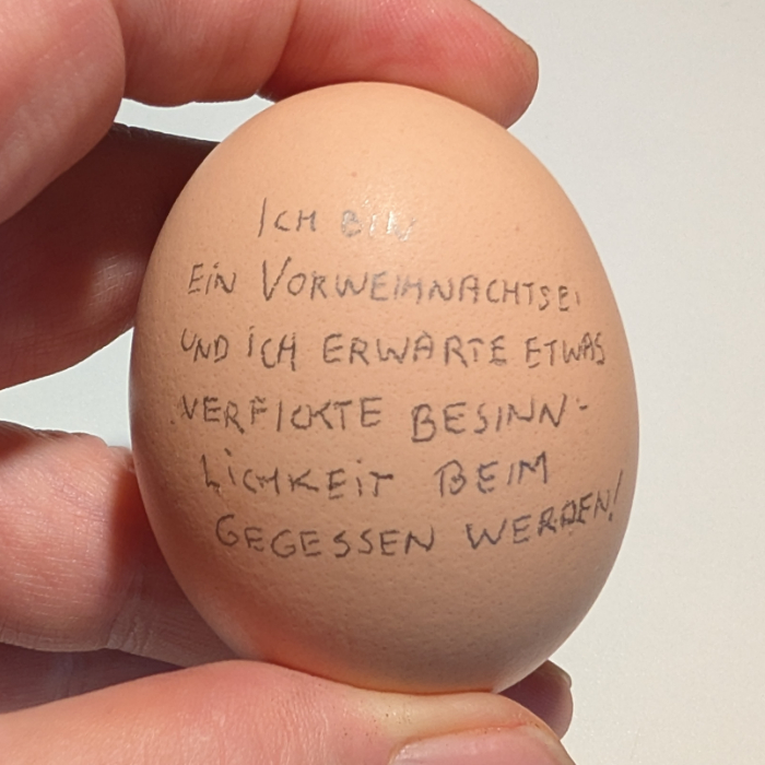 Ich bin ein Vorweihnachtsei und ich erwarte etwas verfickete Besinnlichkeit beim Gegessenwerden!